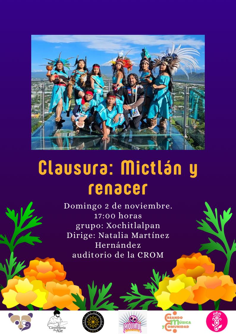 - Clausura “Mictlán y Renacer” – domingo 2 de noviembre, 17:00 h, con el grupo Xochitlalpan.