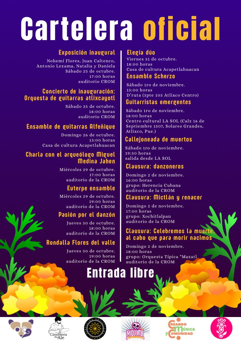 Del 25 de octubre al 2 de noviembre, diferentes escenarios de Atlixco, como el Auditorio CROM y la Casa de Cultura Acapetlahuacan, se convierten en puntos de encuentro para artistas, músicos y amantes de la cultura mexicana.